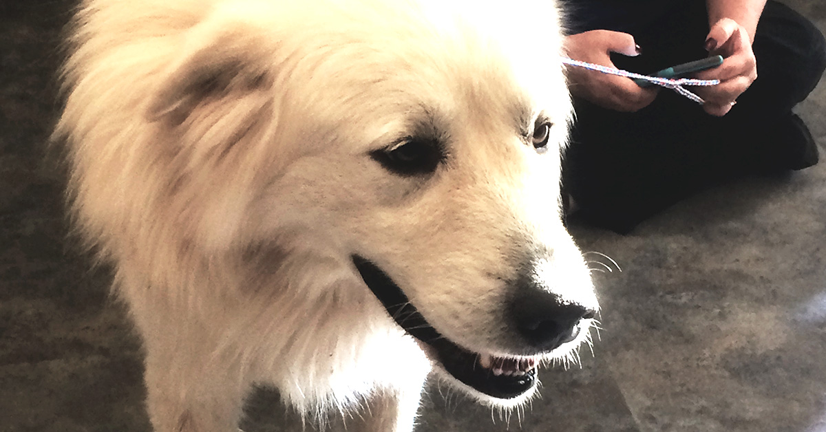 The Great Pyrenees is very mild mannered and enjoys the company of people. He got a lot of love at DAS while he waited for his owners to pick him up. He has a habit of nudging people near him to encourage more petting. DAS received an overwhelming amount of attention from people interested in adopting the dog, but he will be returning home with his owners once he is neutered.