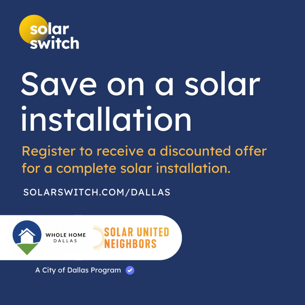 “Solar Energy can help Dallas residents be more prepared for our changing climate. Solar Switch is designed to make installing solar affordable and straightforward for more Dallas residents than ever before.” said Carlos Evans, Director of Office of Environmental Quality and Sustainability.