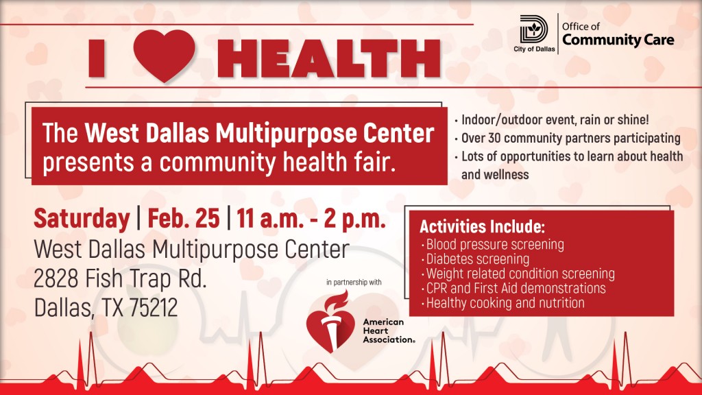 This February, the City of Dallas Office of Community Care will be spreading not only love, but also awareness for National Heart Month by hosting the “I Heart Health” Community Fair with a focus on cardiovascular health and wellness.