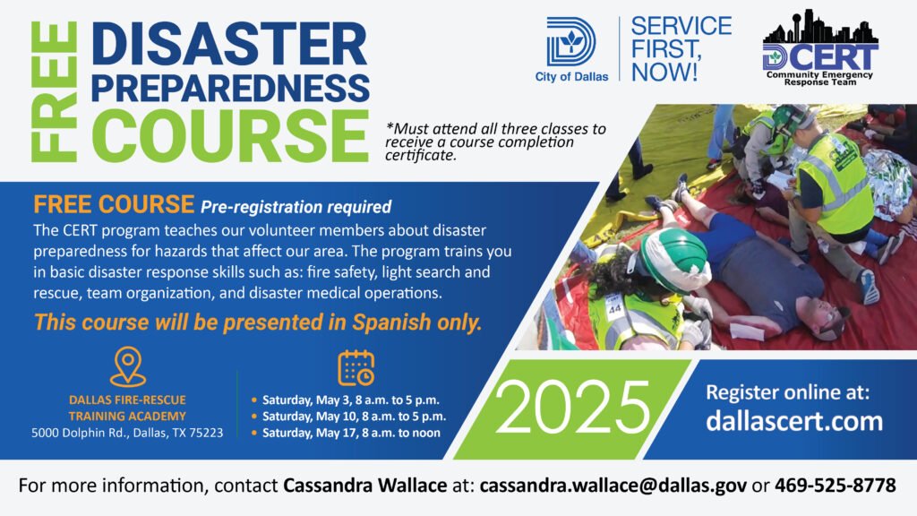 The Dallas Community Emergency Response Team (CERT) program empowers residents with the training and skills needed to support their families, neighbors, and communities during emergencies. Supported by Dallas Emergency Management & Crisis Response, the program offers hands-on instruction in disaster preparedness, basic first aid, fire safety, light search and rescue, and emergency response coordination.