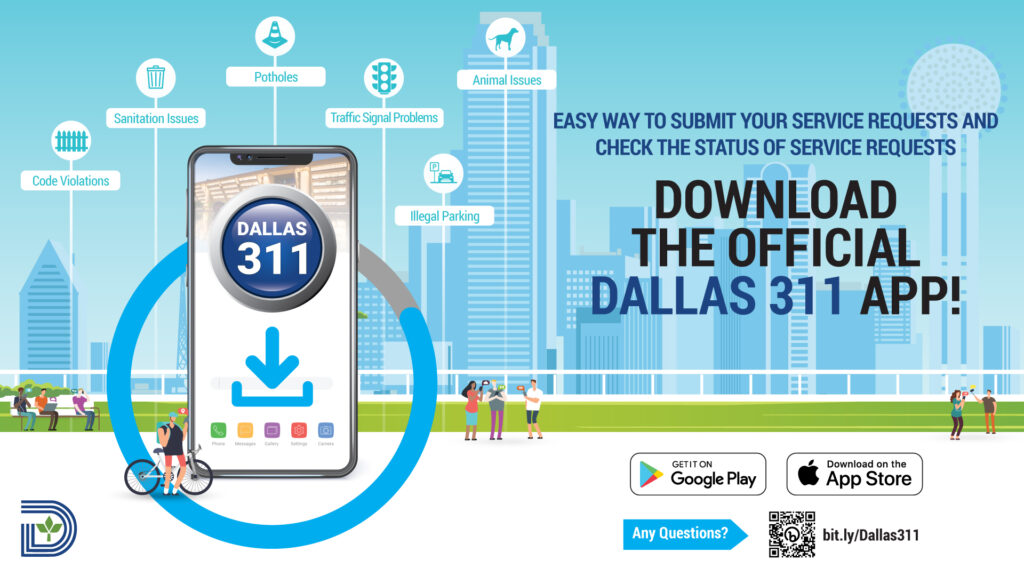 The app is available to download on the Google and App Store. Service request submissions are still available online Dallas 311 Home (site.com) or by calling 311.