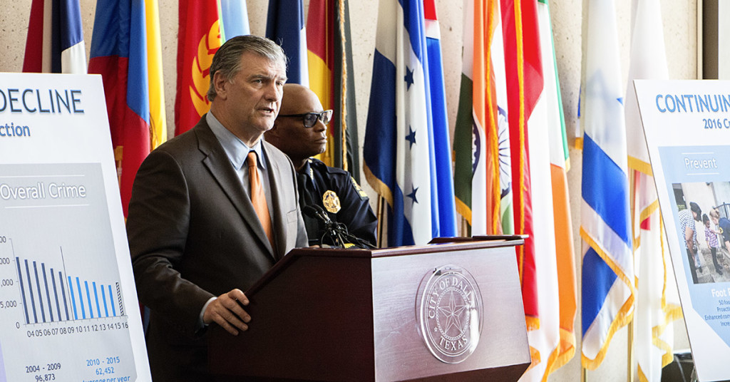 Flanked by Mayor Mike Rawlings, Chief Brown said bringing the crime rate down is “an evolving operational strategy” that will involve close collaboration with state and local officials.