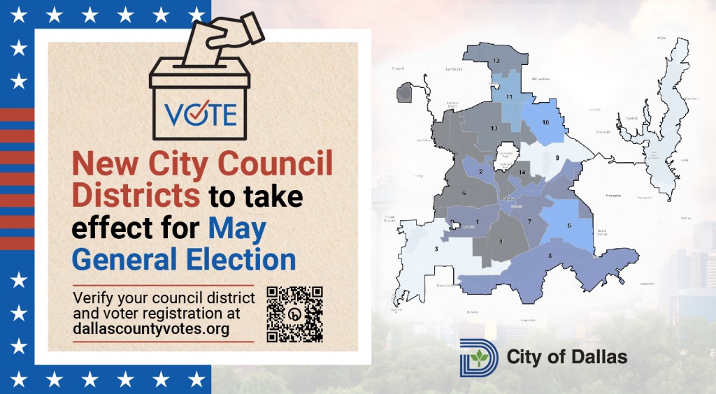 For the upcoming May 6, 2023 General Election, the City Secretary’s Office will utilize the recently adopted redistricted plan boundaries to determine council districts. In addition, City of Dallas voter ballots will be issued based on the adopted redistricting plan council districts. For individuals who wish to verify their City of Dallas council district the Dallas City Secretary’s Office advises residents to only use the Dallas County Voter Registration system: