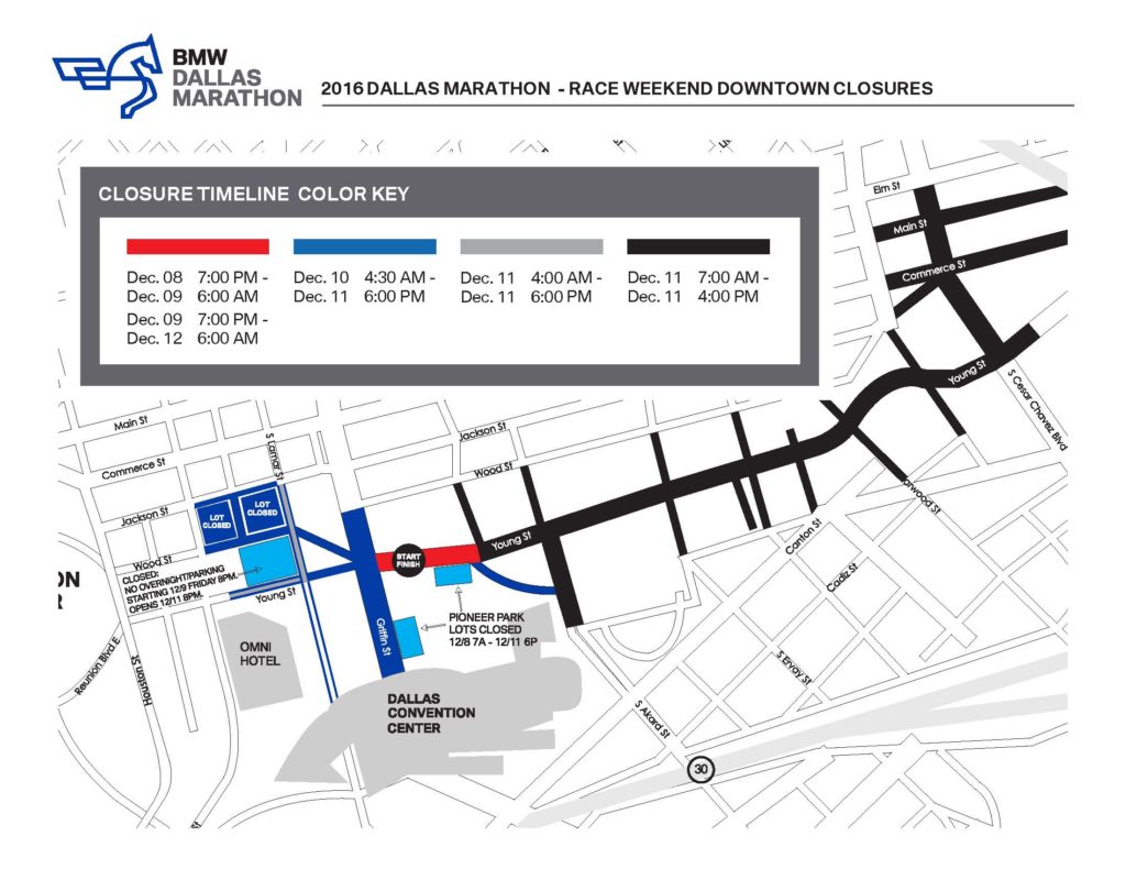 - Saturday from 4:30 a.m. to Sunday at 6 p.m. the following roads will be closed: Griffin St. from Ceremonial to Wood St., Young from Griffin to Lamar, Lamar (curb lanes) from Jackson to Ceremonial, Young (curb lanes) from Lamar to Omni entrance, Wood from Lamar to Market; Jackson (south curb lane) from Lamar to Market, Austin from Wood to Jackson; and Marilla from Akard to Young.