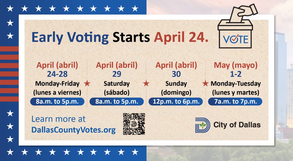 Early voting for the May 6 General Election Begins on April 24 until May 2. April (abril) 24-28 Monday-Friday